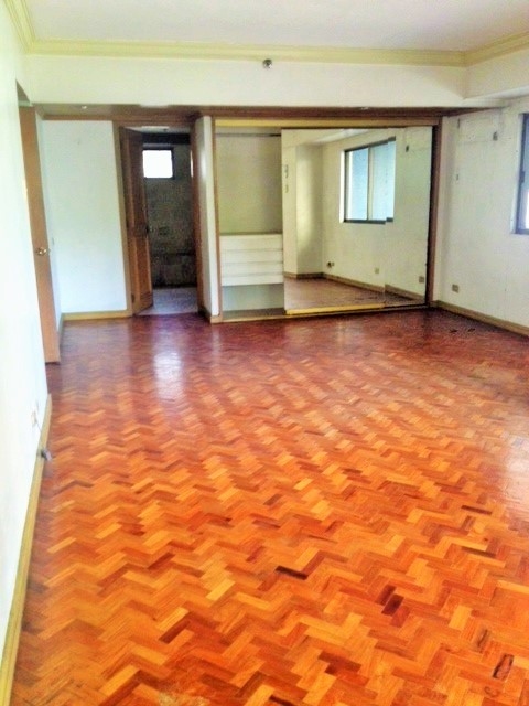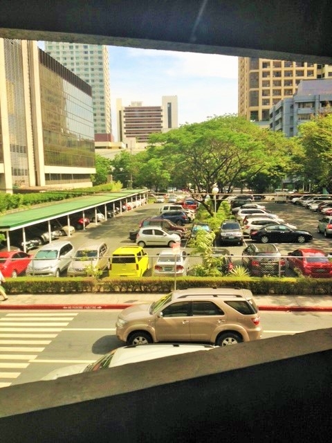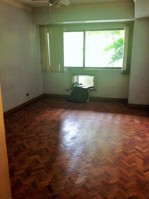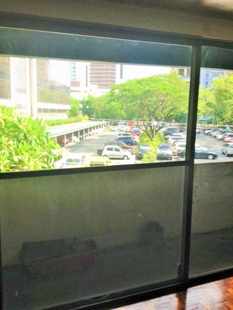 Spacious living area has access to a balcony with the view of Legaspi Park parking area.