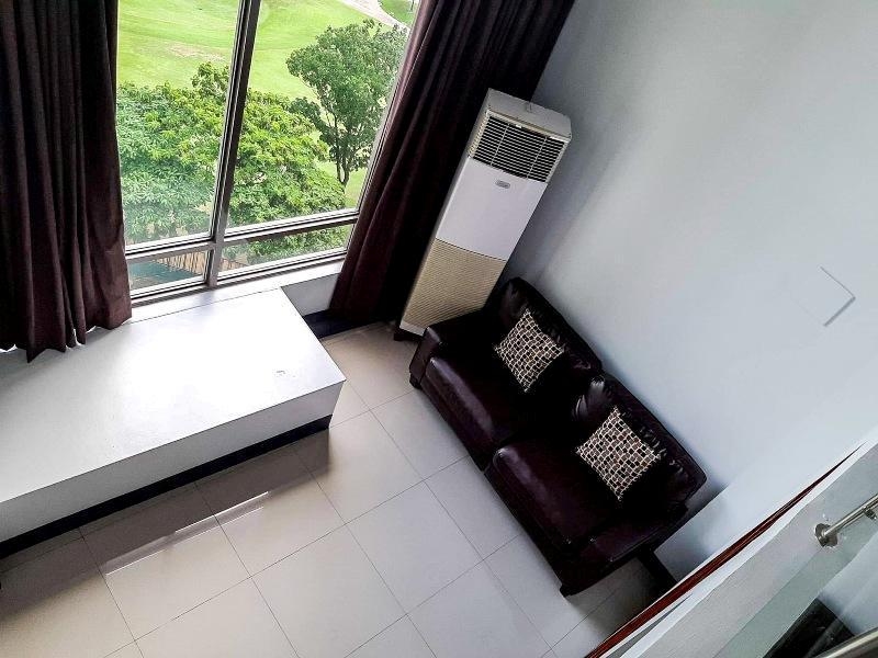 Living area has breathtaking view of golf course and furnished with brown colored couch, accent rug and floor standing air-conditioning