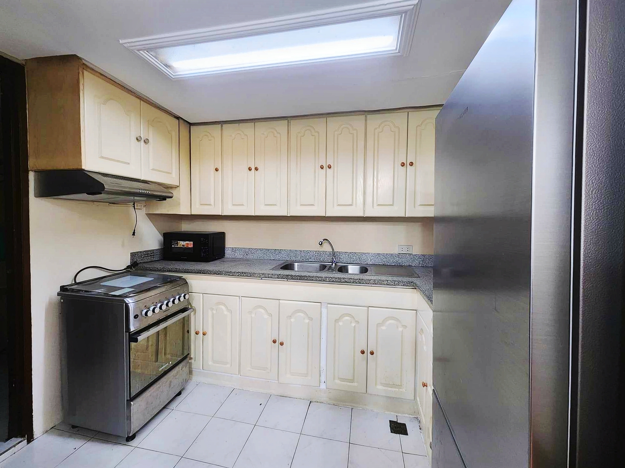 Open fitted kitchen with new sink and worktop, equipped with Samsung refrigerator, electric stove, range hood and microwave oven