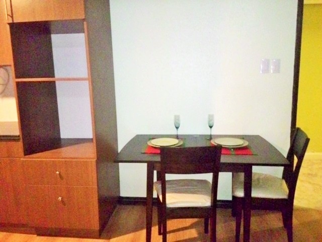 This combination of modern and classic studio unit in the Makati Citadel Inn has a stylish interior. The living room and dining area provides a generous living space and comes with all necessary appliances and furniture including dining set, comfortable sofa and air conditioning.