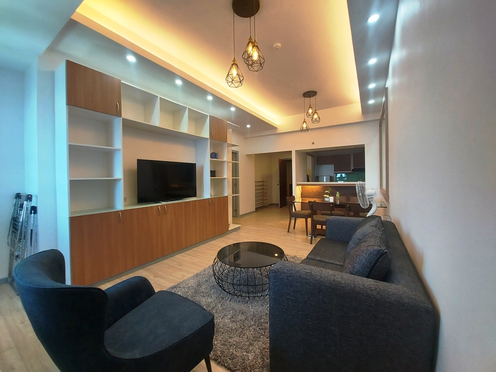 Living area is furnished with couch, accent chair, area rug, center table, fitted TV rack and shelves, flat screen TV and has an overlooking view of Manila Bay