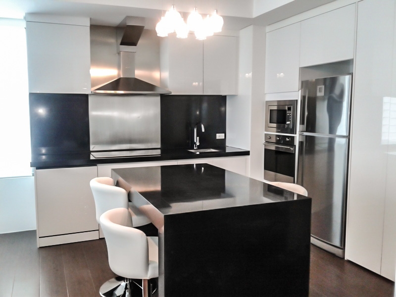 Beautiful center island-designed kitchen that accommodates a 4-person dining table and comes with built-in German appliances including a refrigerator, induction stove, oven, microwave, dishwasher and stacked washer dryer