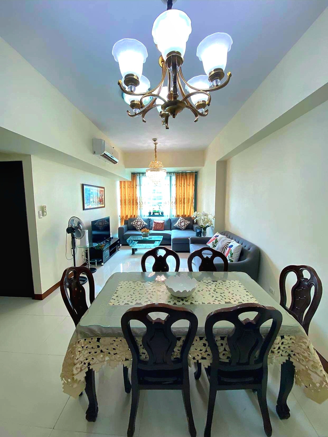 Living area is furnished with a dark-colored sofa set, wooden coffee table with an area rug underneath and complete with a large LCD TV
