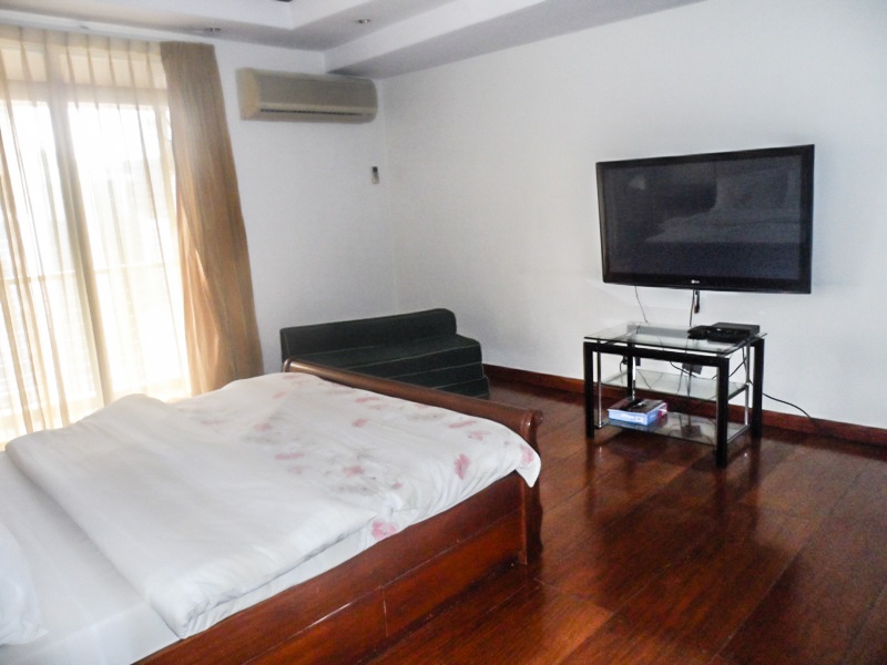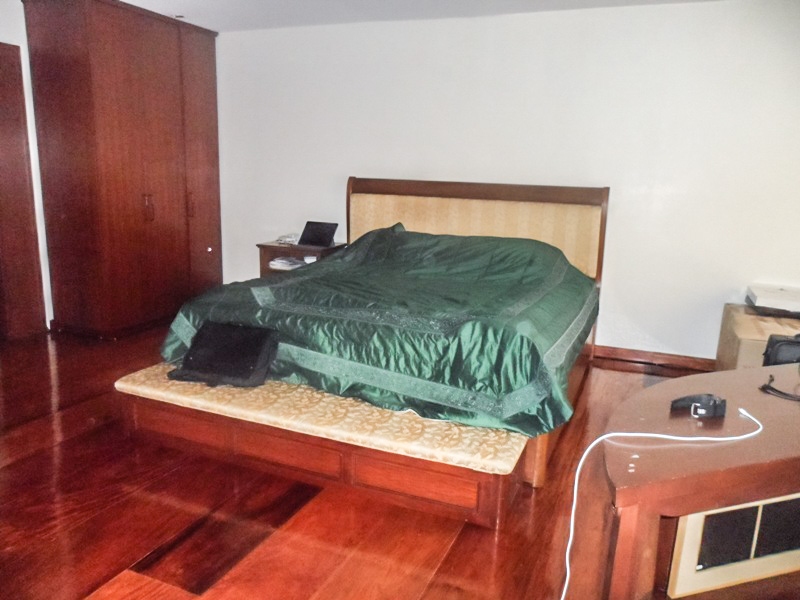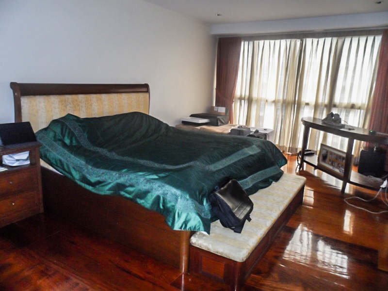 Roomy master bedroom boasts a king size bed, side tables, office desk at the corner, free standing wardrobe and en-suite shower room