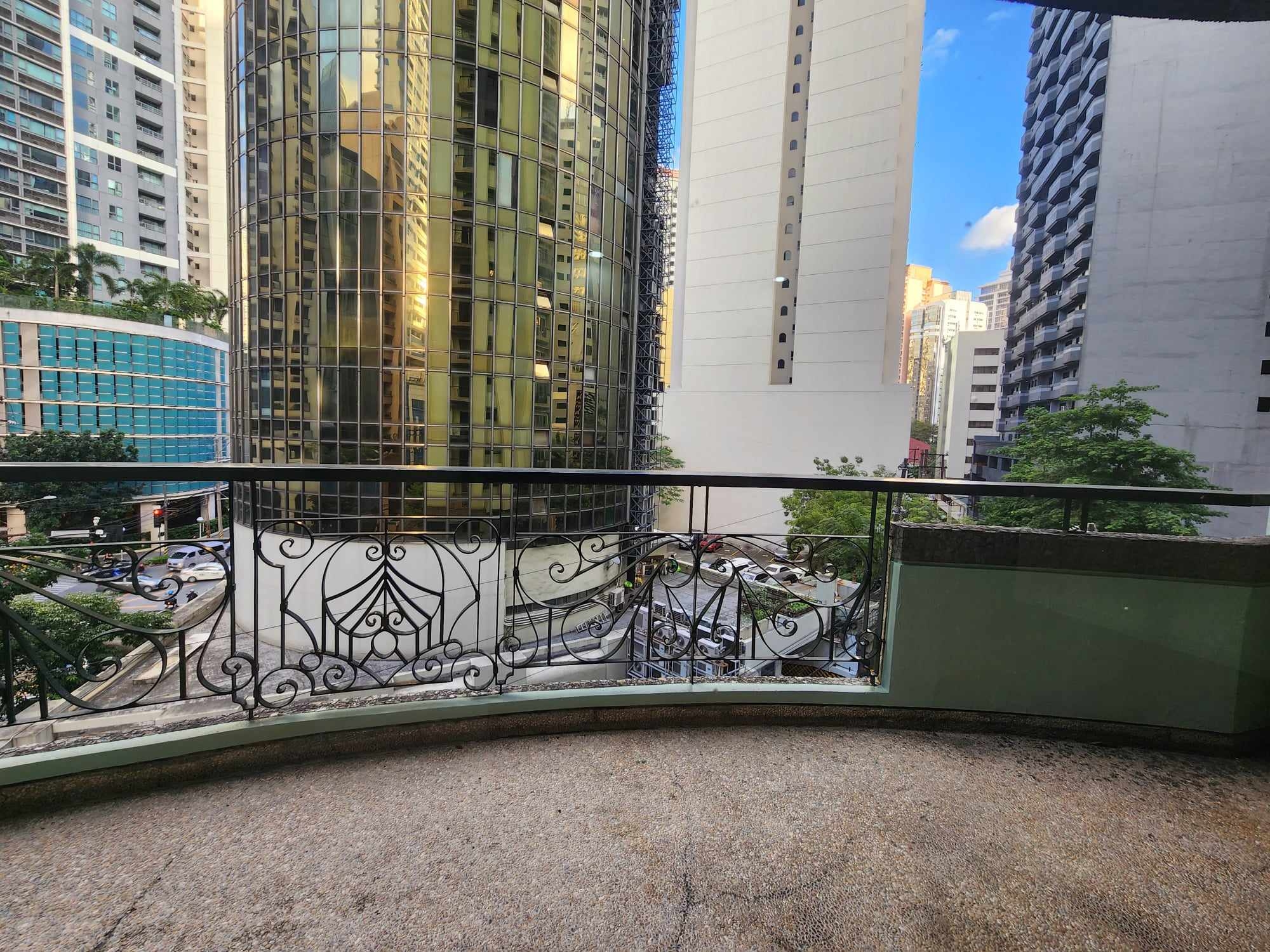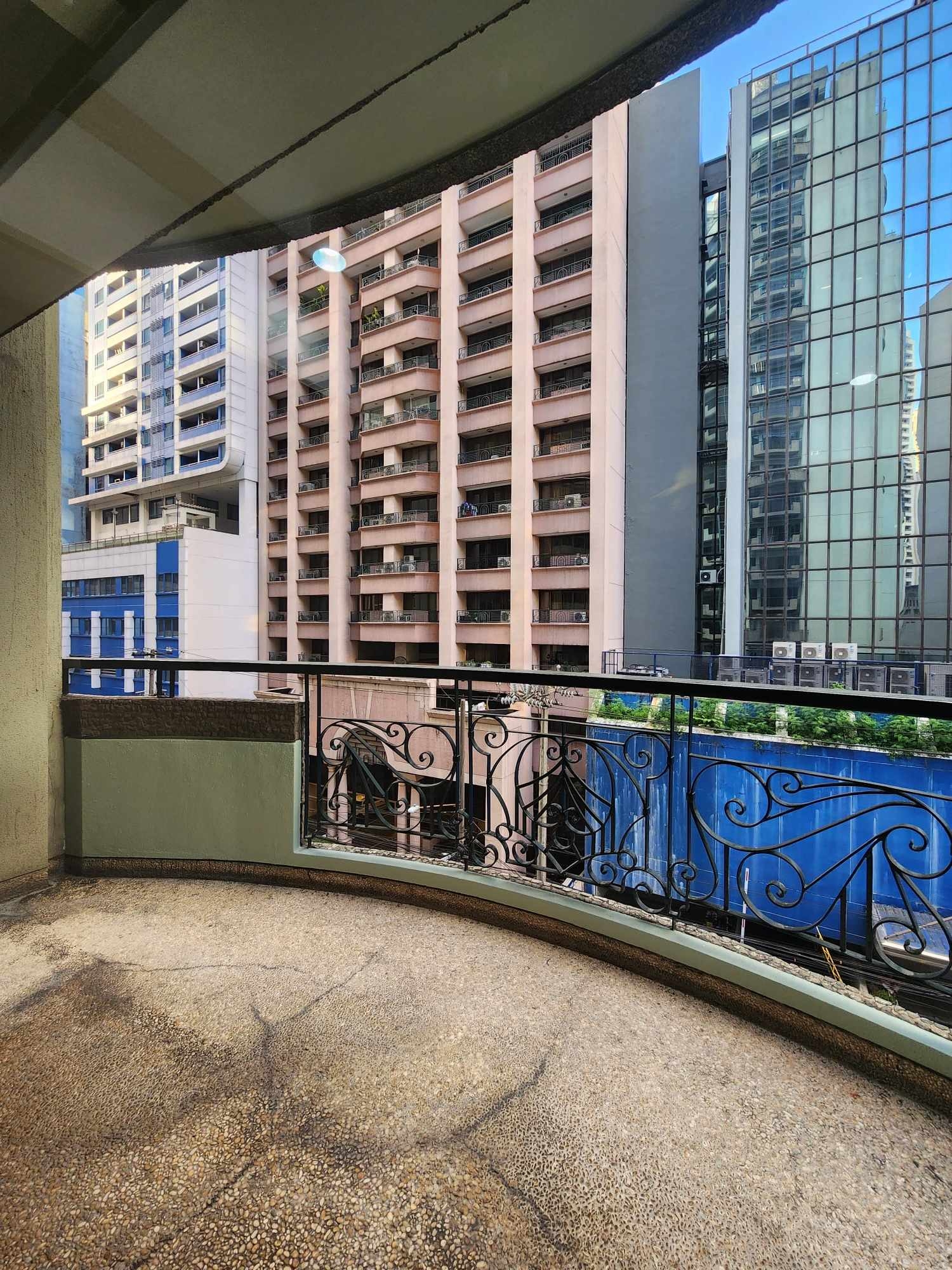 Master bedroom is furnished with a built-in desk, window type air-conditioning and has access to a large curved balcony