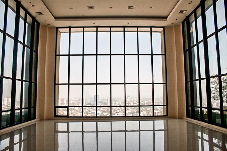 Living area benefits from floor to ceiling windows providing plenty of natural lights and comes with a dining table, cabinets and split type air conditioning