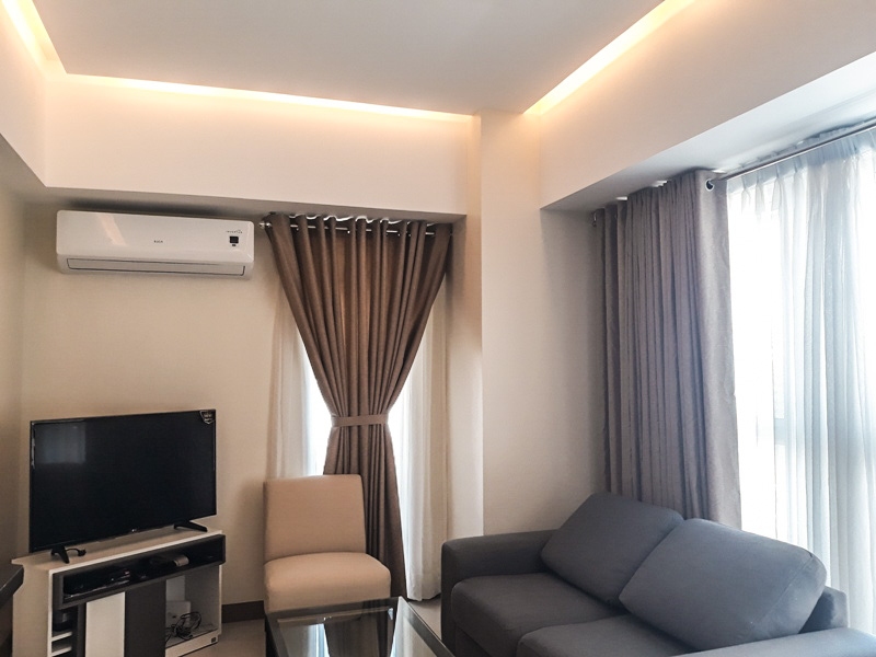 Living area is tastefully decorated in a combination of neutral colors and is furnished with a two seater grey couch, TV rack, flat screen TV, DVD player and split type air-conditioning