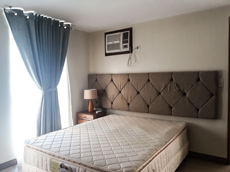 Master bedroom has a queen size bed with headboard and bedside table with lampshade and window type aircon