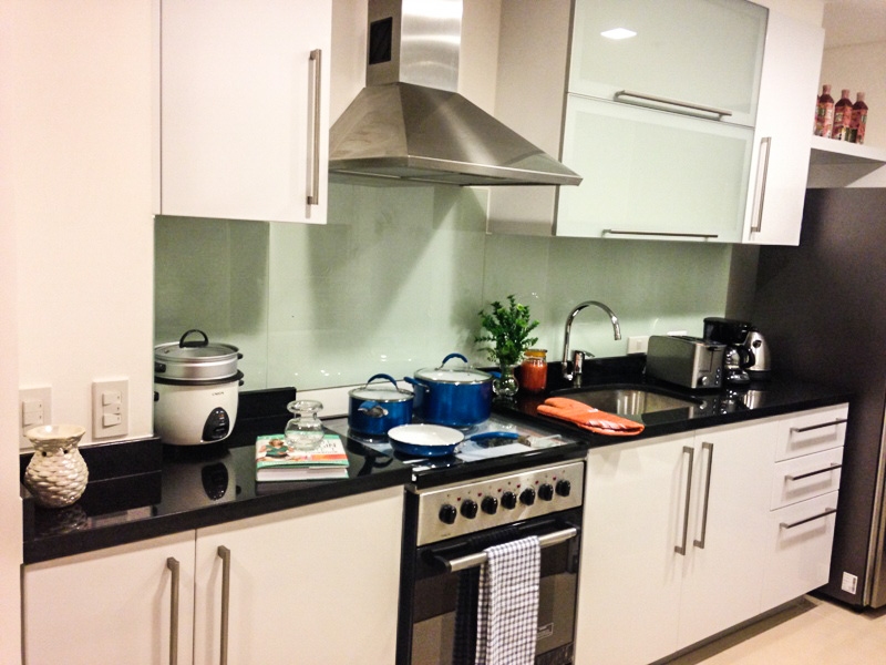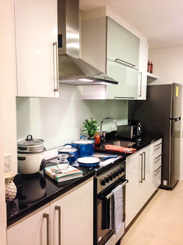 Open plan kitchen with built in cabinets is furnished with all major appliances such as refrigerator, electric stove with range hood, rice cooker, toaster and coffee maker