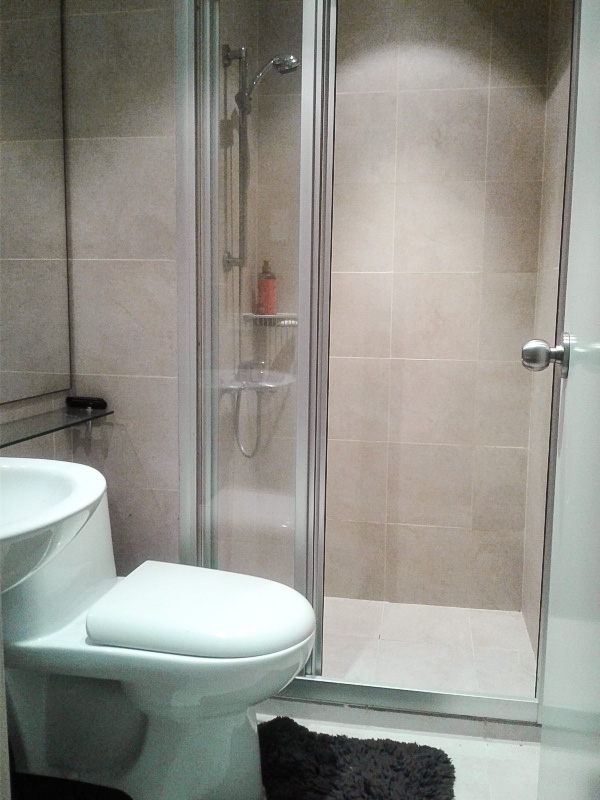 Modern fitted kitchen area with Refrigerator and built in 2 ring hob with range hood