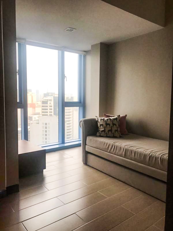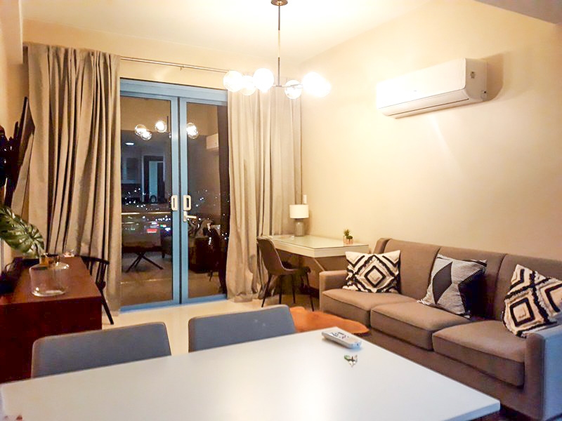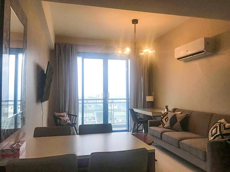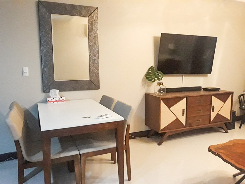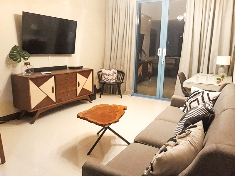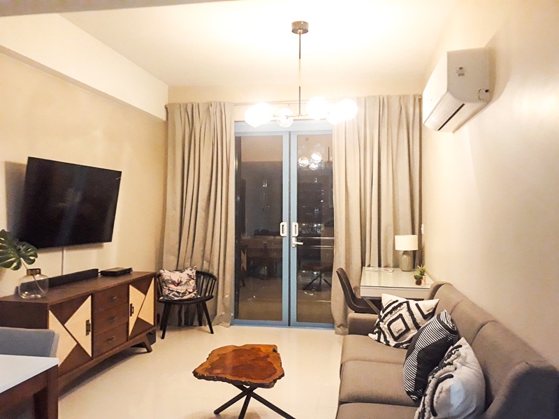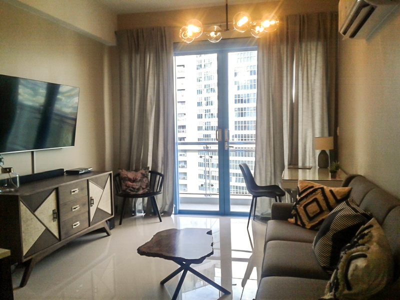 Spacious living room with oatmeal couch, 55 inch wall mounted Samsung TV and separate study desk and has access to the balcony with lofty views over Makati towards Manila Bay