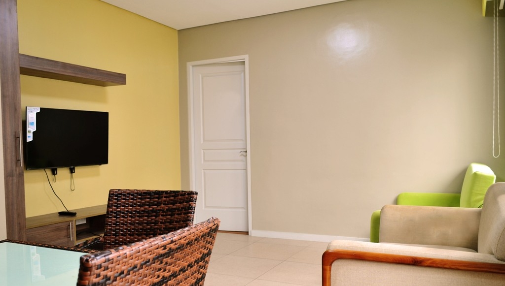 Bright living area is furnished with a TV rack and flat screen television and is cooled by a window type air-conditioning unit