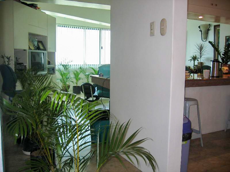 Bright living area has 180 degree movable entertainment cabinet, black leather sofa, recliner chair, television, paintings and a Bose 5 speaker sound system with Onkyo Amplifier