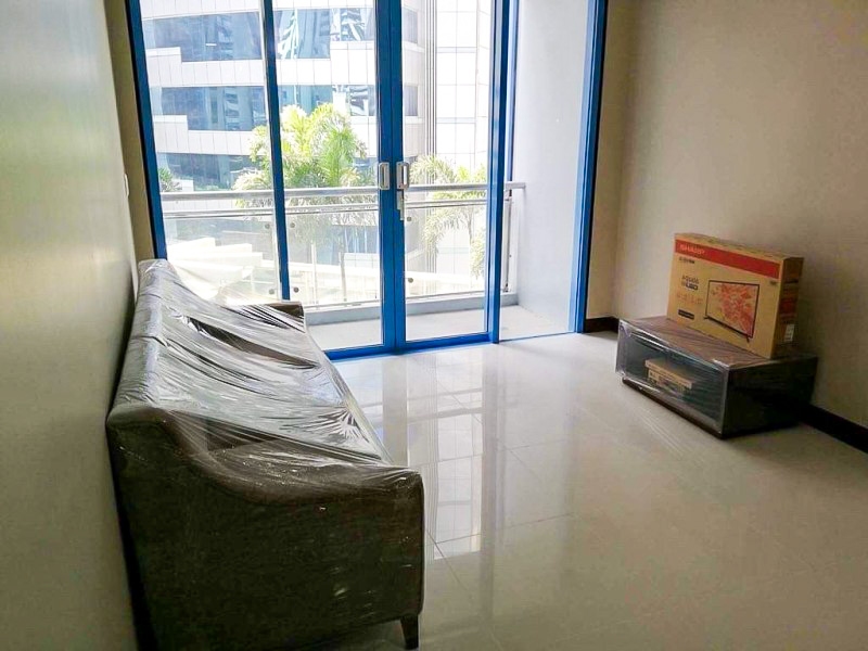 Living area comes fully-furnished with a grey 3 seater sofa, 32 inch Sharp TV and DVD player and has access to the balcony