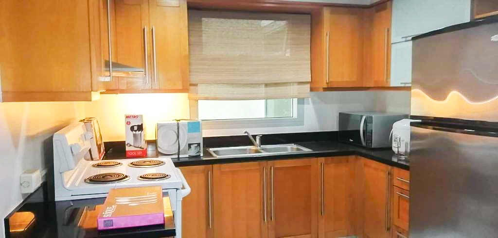 Modern, open plan kitchen comes with electric stove, refrigerator, rice cooker and microwave