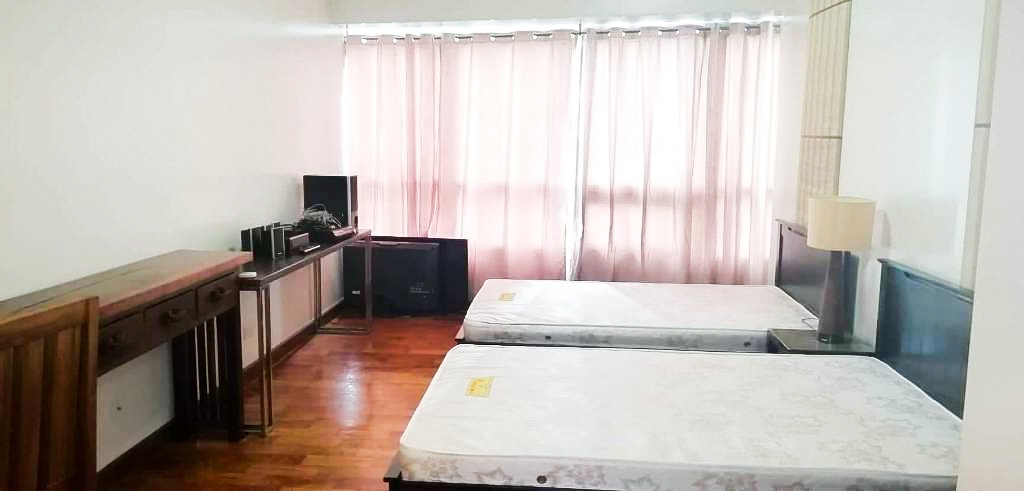 Second bedroom contains 2 double beds, study table, flat screen TV and bedside tables with lamps