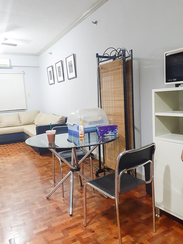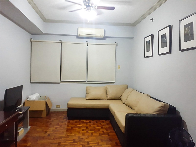 Living area has a comfortable L-shaped sofa, flat screen TV, TV rack, side table, electric fan and split type air conditioning