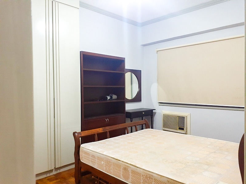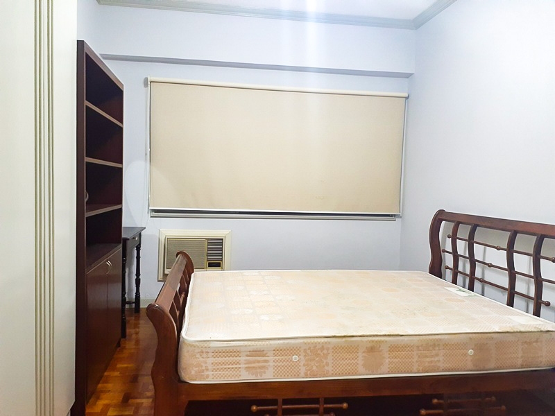 Bedroom has a queen size bed, built-in wardrobe, bookshelves, vanity table and window type air-conditioning