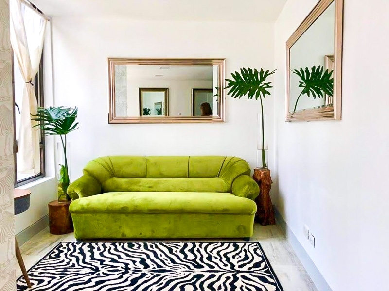 Living area contains a comfortable green sofa, accent rugs and a cozy reading nook