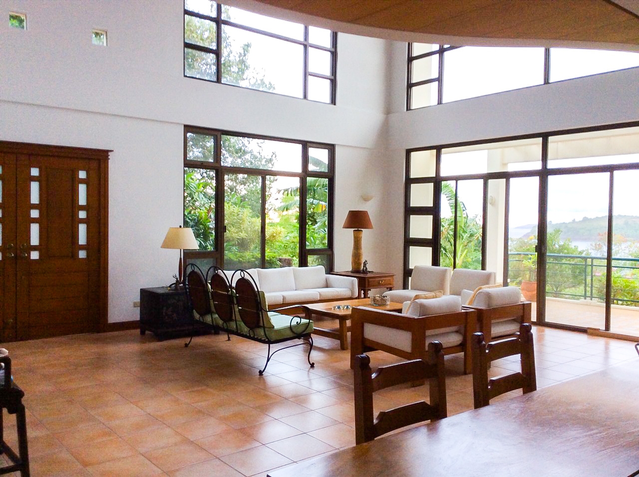 Spacious airy living room with a tiled floor and very high ceiling is furnished with a 3 seater couch, 2 seater sofa and 2 accent chairs