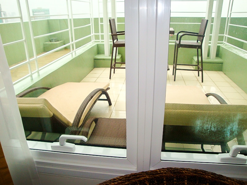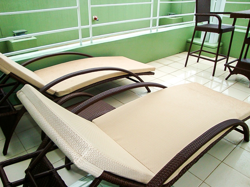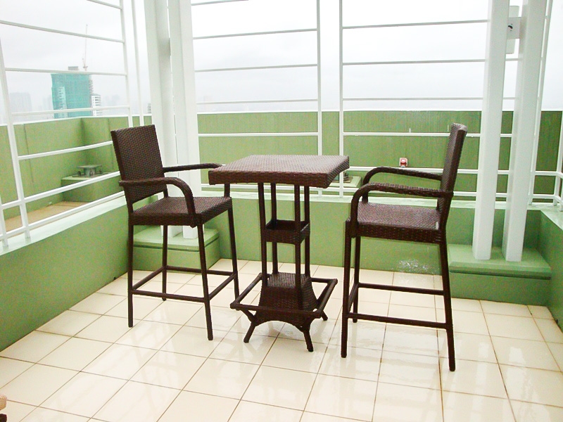 Spacious balcony has two modern reclining chairs and high outdoor table and chairs