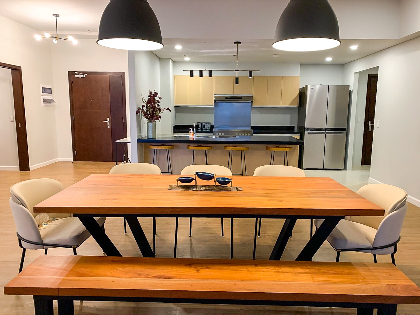 Open plan modern kitchen with fitted cupboards, cooker and double door refrigerator