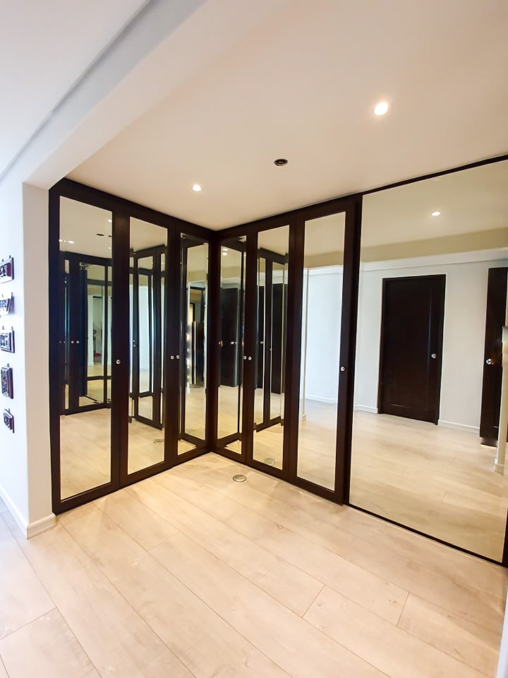 Spacious master bedroom is furnished with black out curtains, a king size bed and has a mirrored walk-in closet