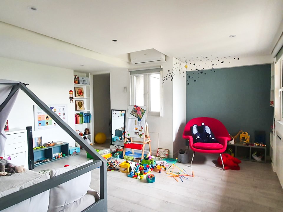 Spacious living area furnished with a dark grey L-shaped sofa set, large built-in shelving unit, 65" flat screen TV and modern blinds