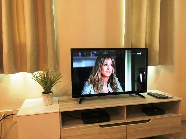 Stylish living area furnished with queen size bed, sofa bed, artwork, cabinet, TV rack, flat screen TV and wall type air-conditioning