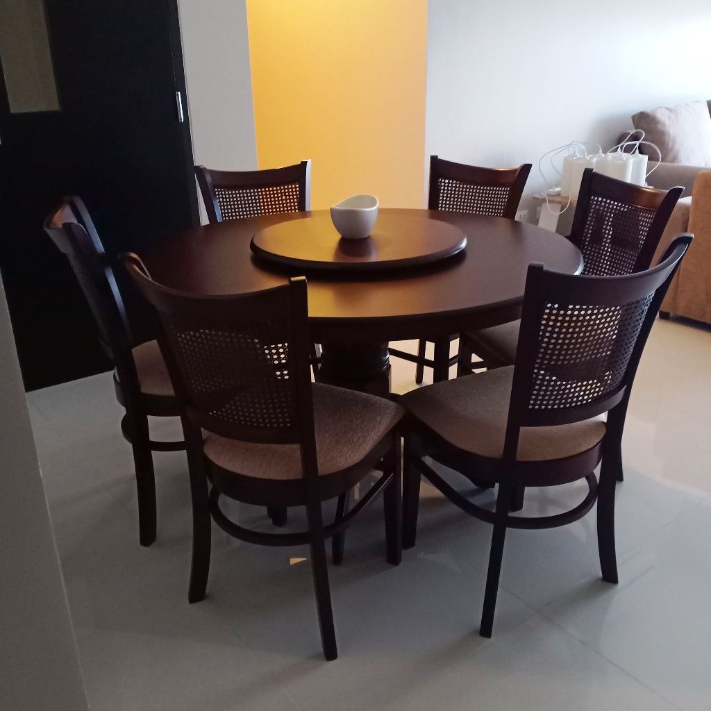 Spacious living area is furnished with a sofa set, coffee table, side tables, flat screen LED TV, TV rack with shelves, venetian blinds and dining table that comfortably seats 6