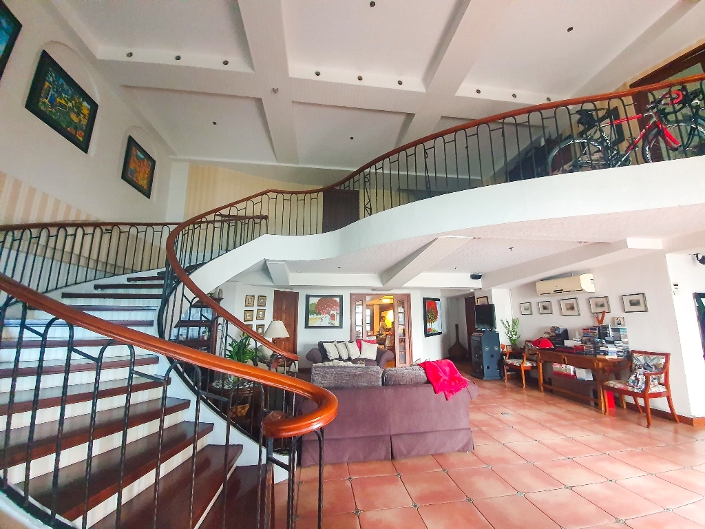 Spiral staircase leads to a mezzanine floor containing 5 bedrooms