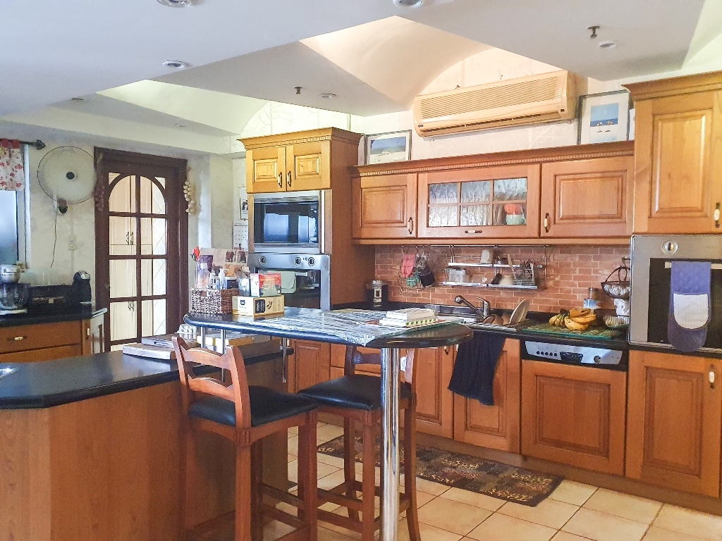 Large kitchen with built-in appliances including double door refrigerator, cooker with oven and dishwasher has a central island with sink and breakfast bar