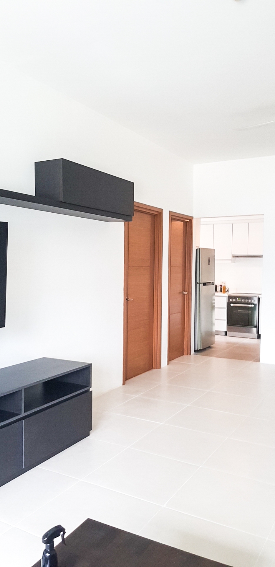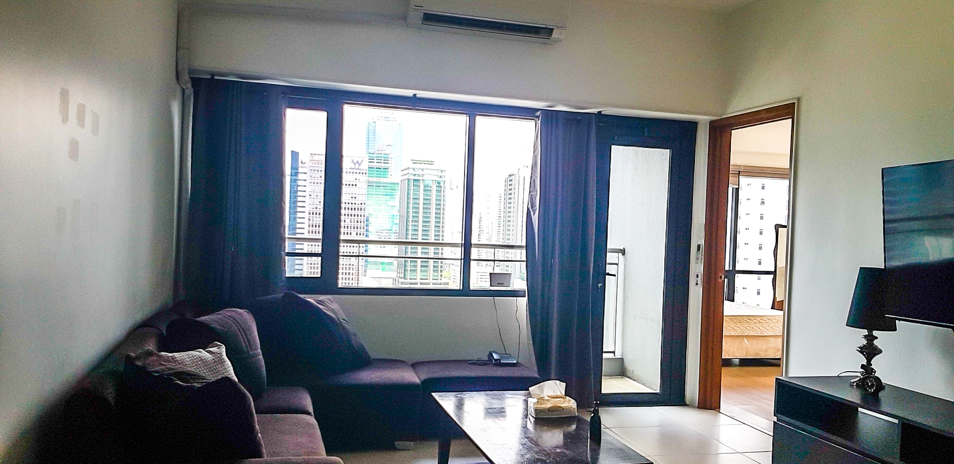 Living area is furnished with an L-shaped brown couch, coffee table, wall-mounted television, split type air-conditioning and has access to the balcony
