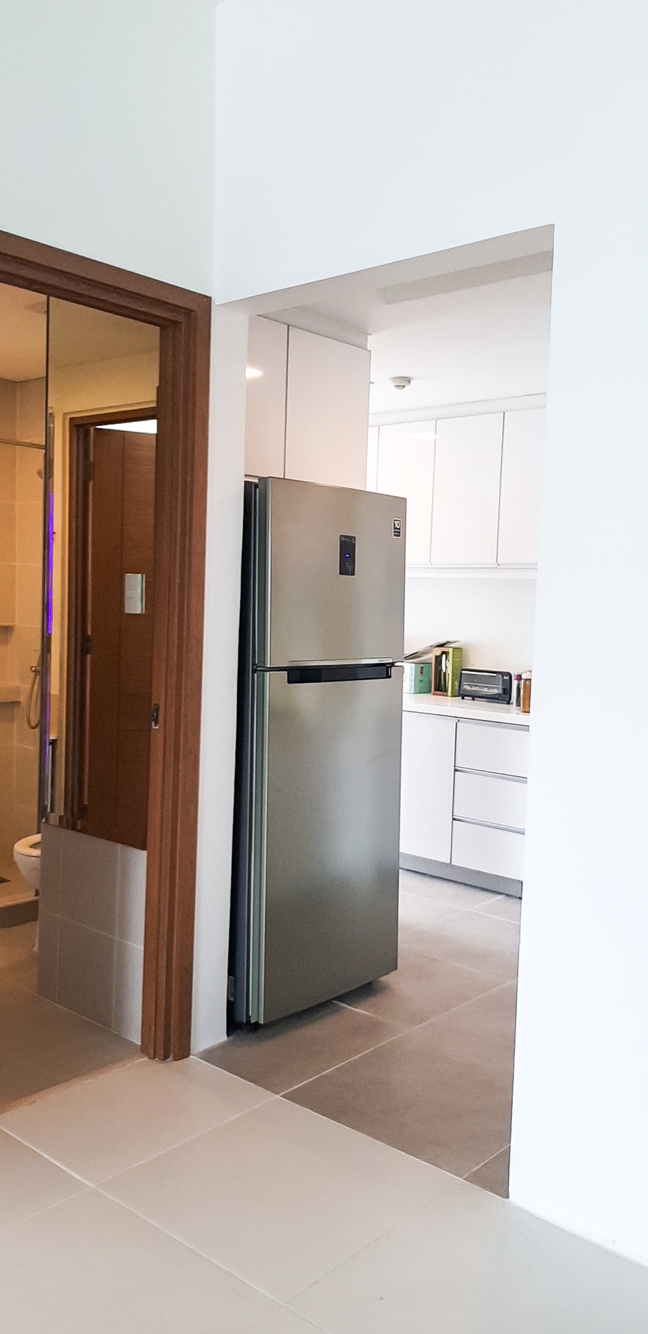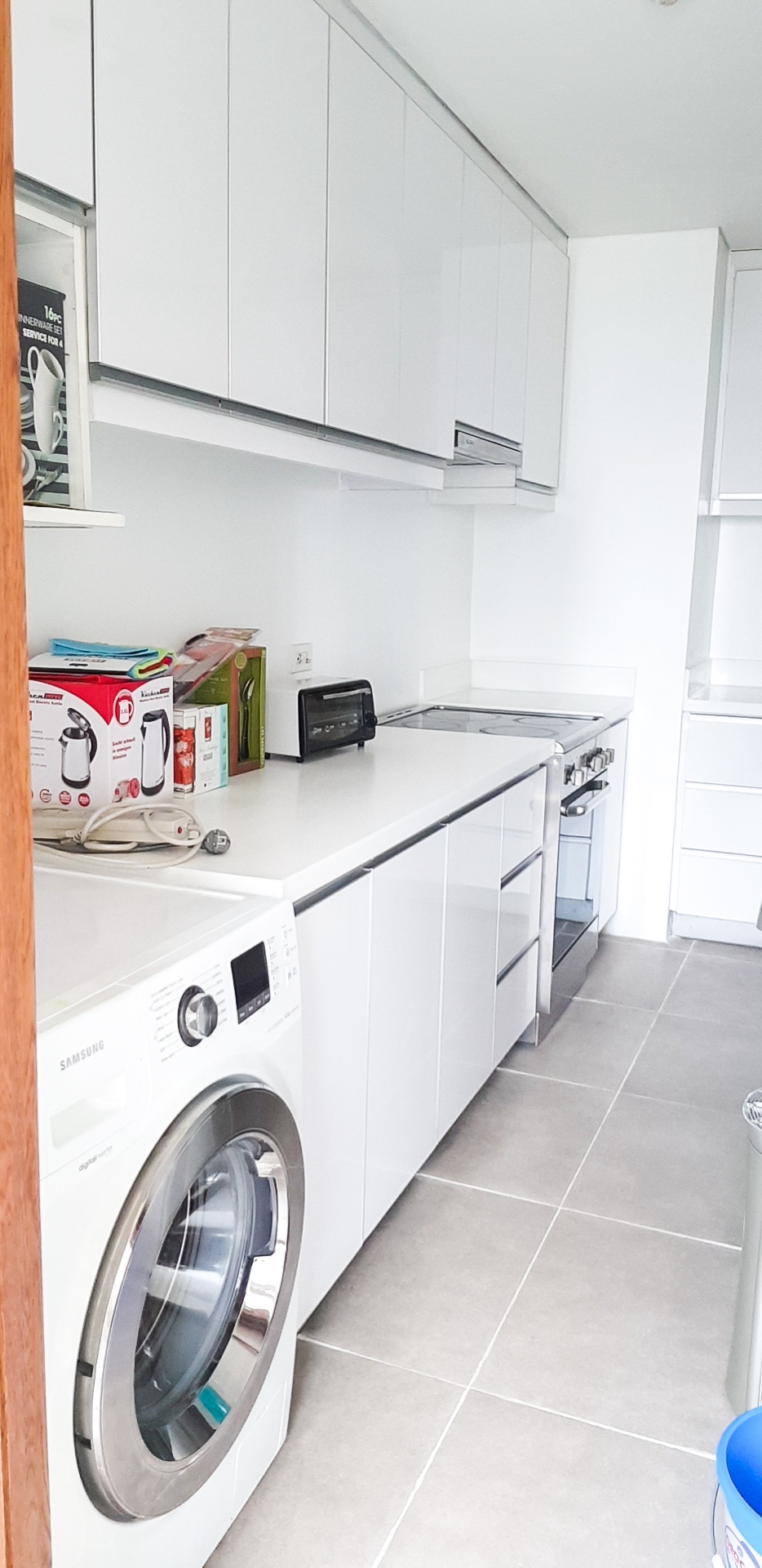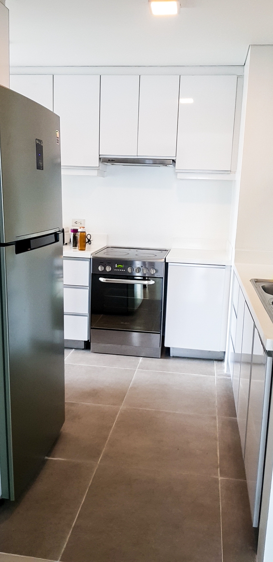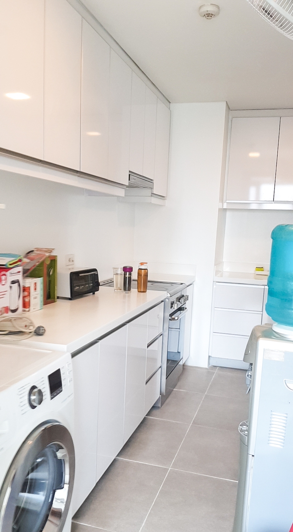 Kitchen area has fitted cupboards and is equipped witha refrigerator, electric stove with range hood, water dispenser and washer &dryer