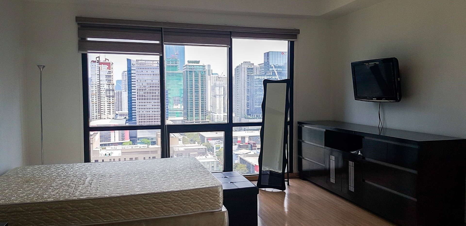 Master bedroom is furnished with a queen size bed, wall mounted television and mirror