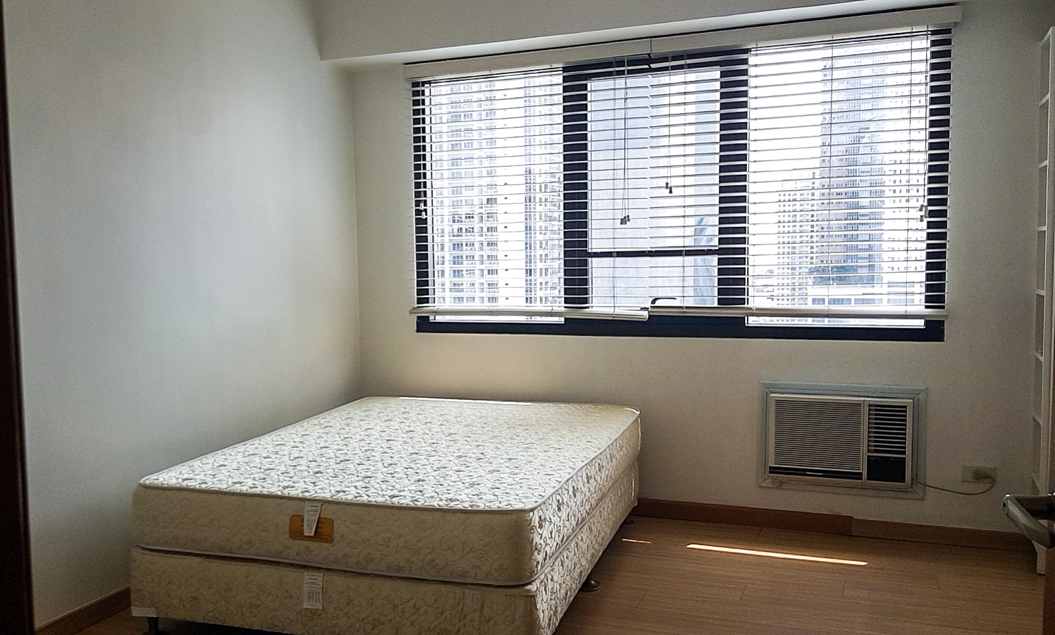 Second bedroom has a double sized bed, window type air-conditioning, and blinds