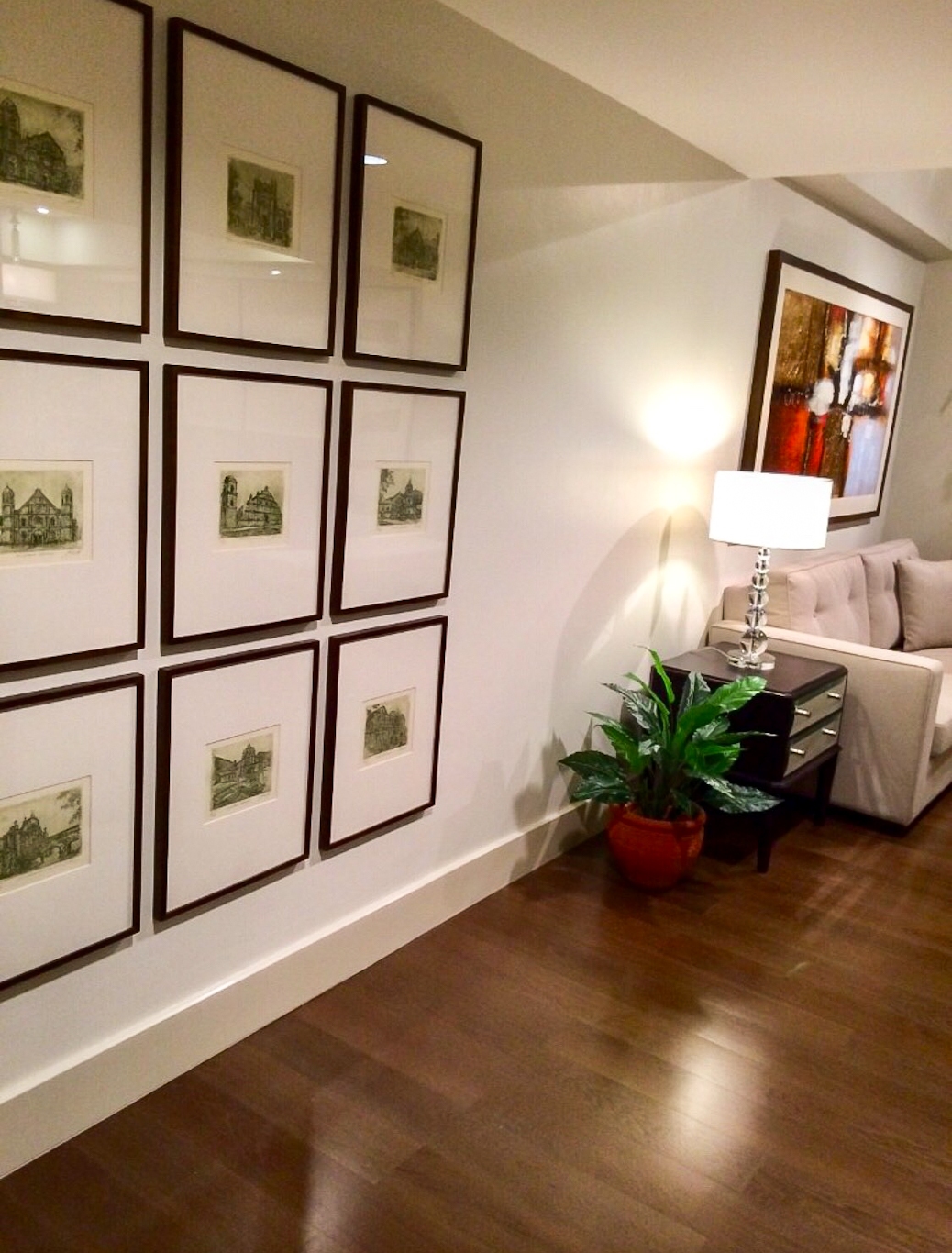 Living room is furnished with a sofa, side table, with lamp, accent chair, long bench, flat screen TV, TV rack, wooden center table, plants, artworks, console table and wall mirror