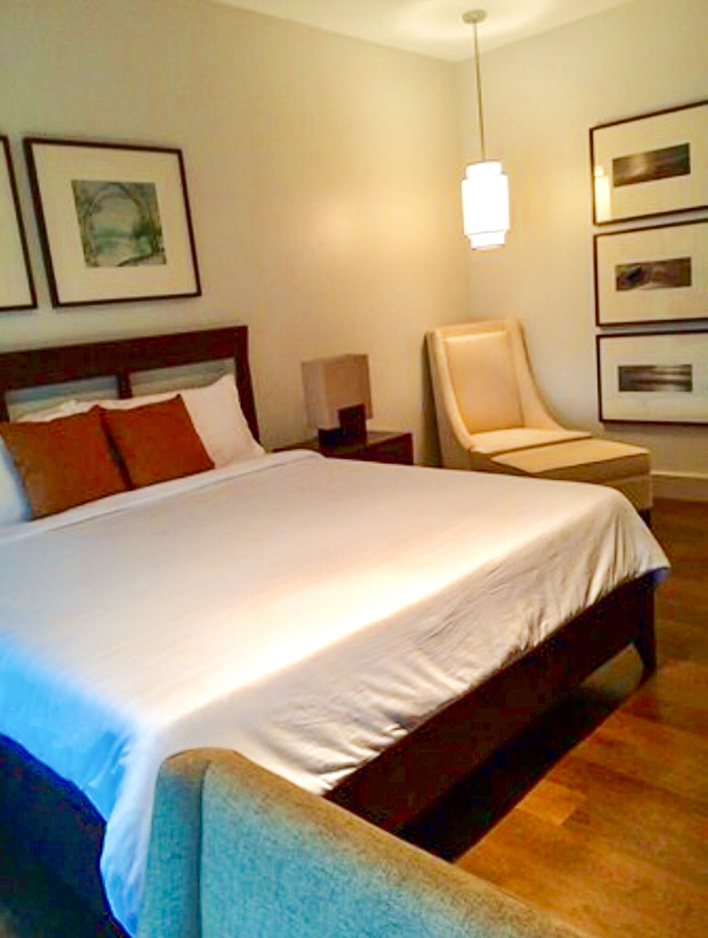 Spacious master bedroom with queen size bed, bedside tables, accent chair, foot stool and en-suite bathroom
