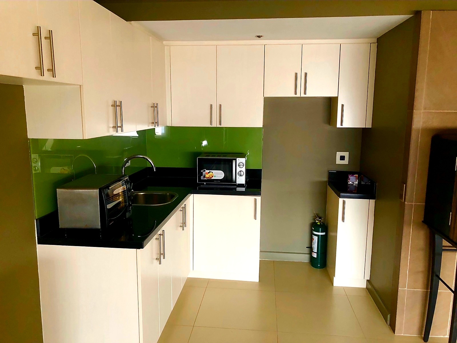Open plan fitted kitchen comes with oven toaster, microwave oven, and refrigerator