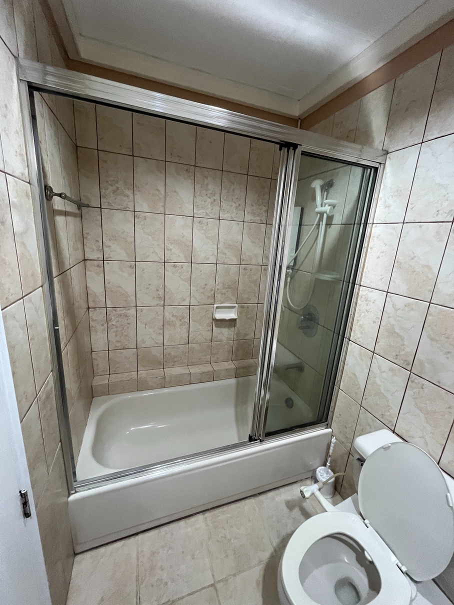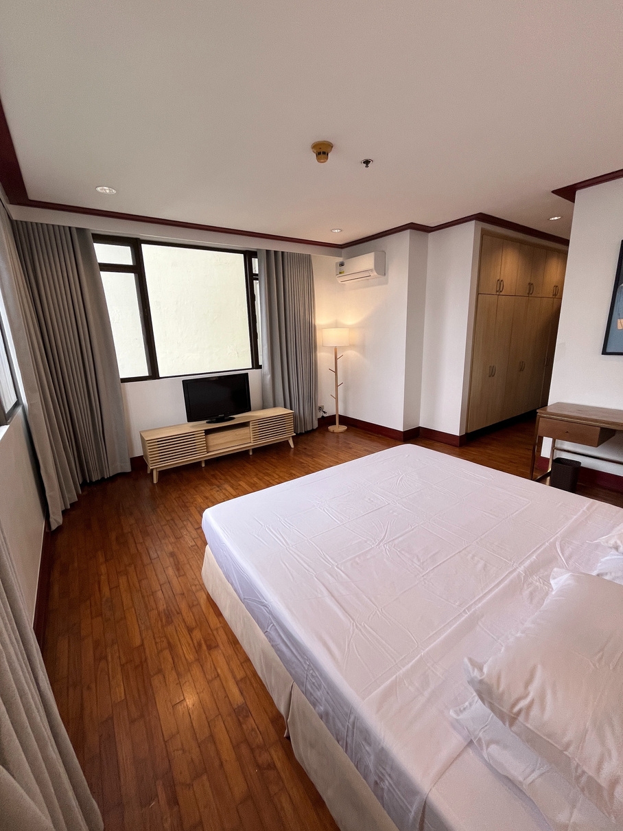 Spacious master's bedroom with king size bed, study table, block out curtains, TV console, floor lamp, fitted closet and has en-suite bathroom with bathtub and heater