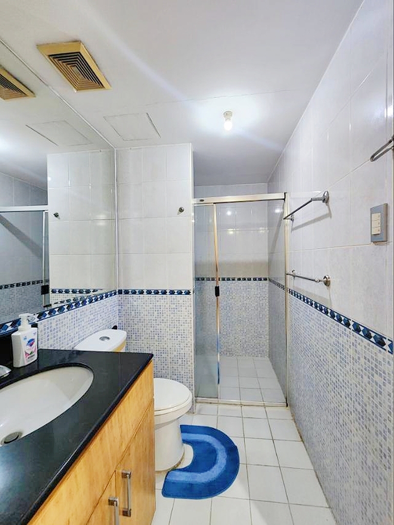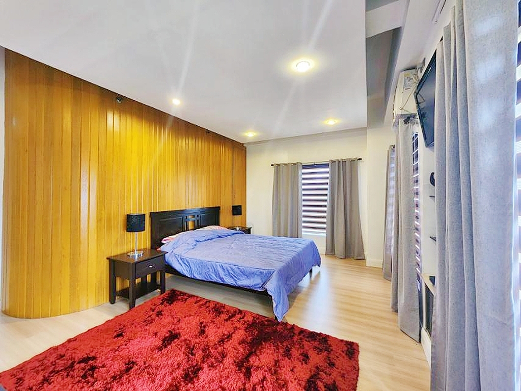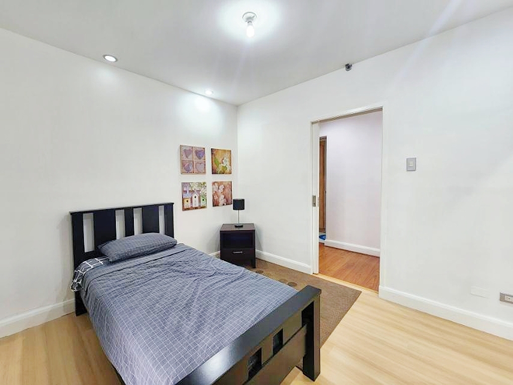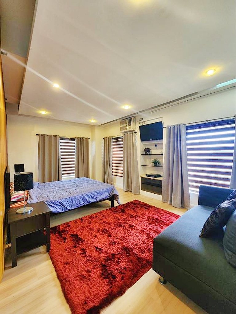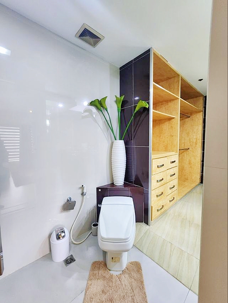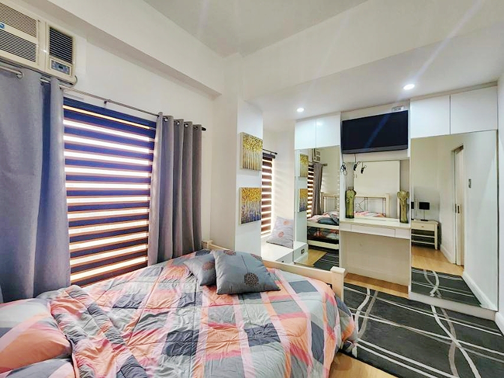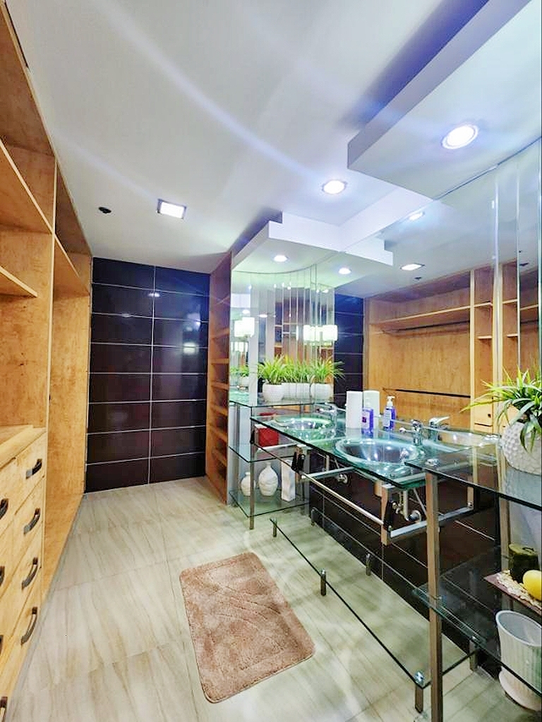 Well decorated master bedroom enjoys full views of Makati from its corner perch and comes with en-suite shower room that includes wardrobe storage and his and hers sinks