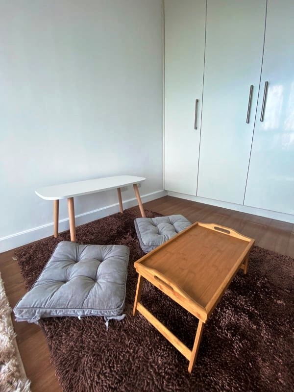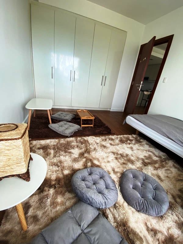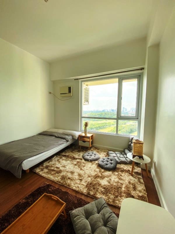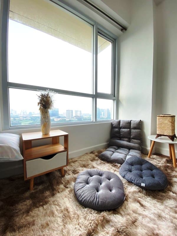 The living area is furnished with an L-shaped cream colored couch, brown rug, artwork and window type air-conditioning