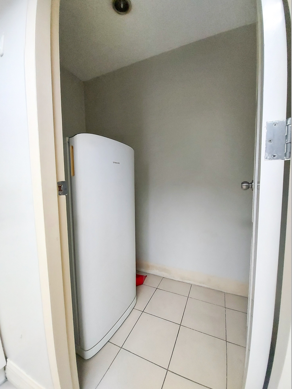 Separate spacious kitchen with fitted cabinets, refrigerator, electric stove and has adjacent utility area.