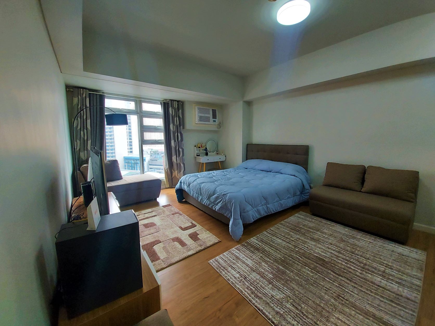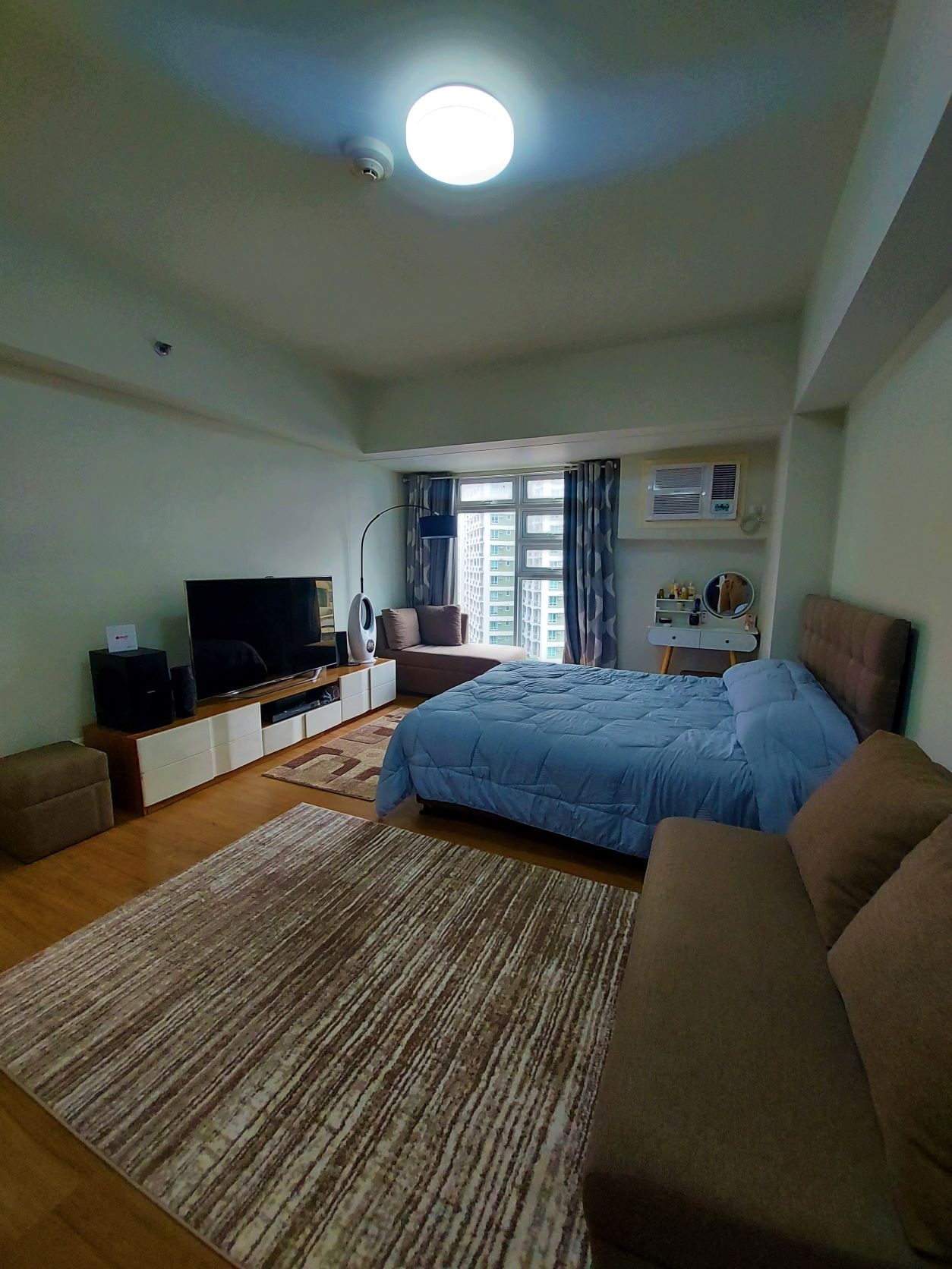 Bedroom area is furnished with a queen sized bed, flat screen television, sound system, floor lamp, bedside table with vanity mirror, and window type air-conditioning