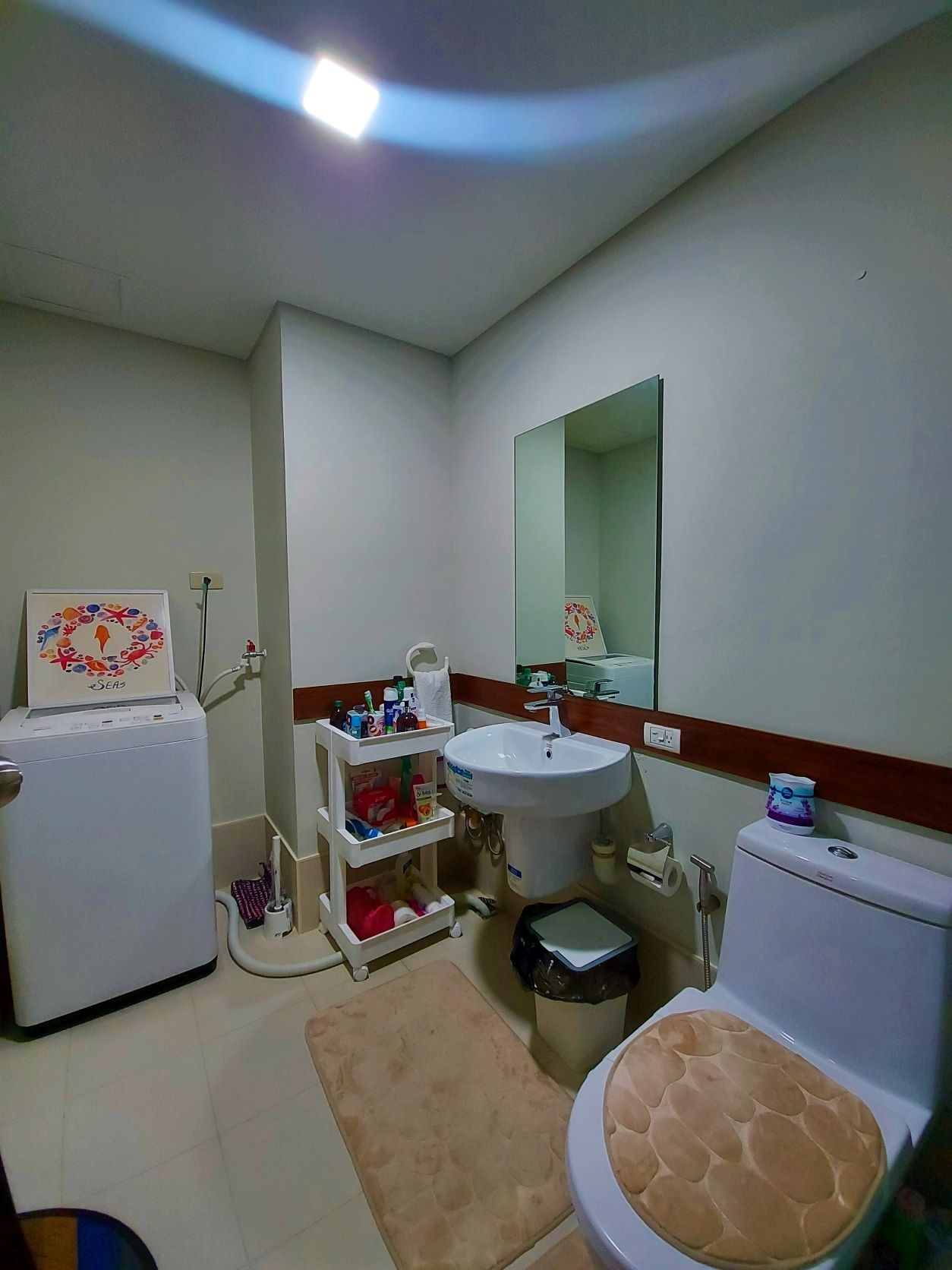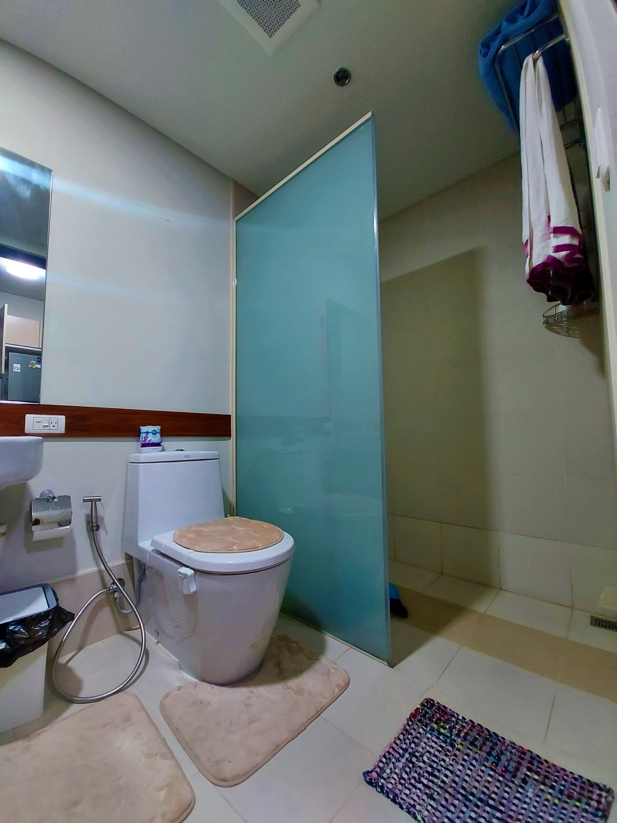 Bathroom has shower glass partition, washing machine, mirror and bidet