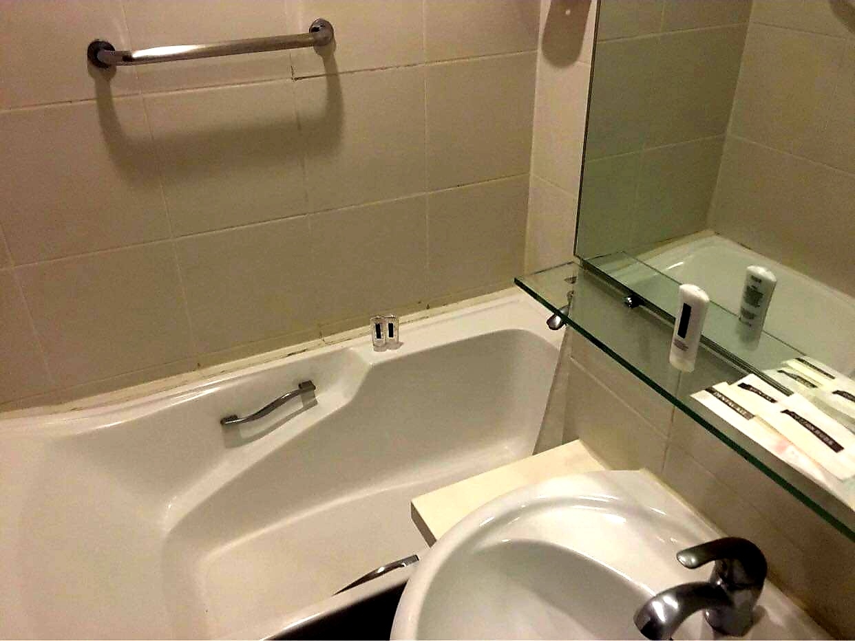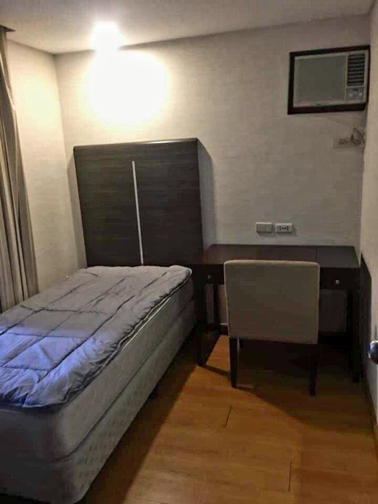 Master bedroom is furnished with a single bed, study table, chair, wall type air conditioning and en-suite bathroom with bathtub