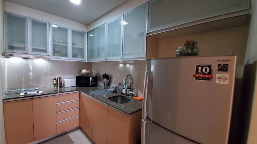 Kitchen area has fitted cupboards and equipped with stove, range hood, refrigerator, microwave and toaster