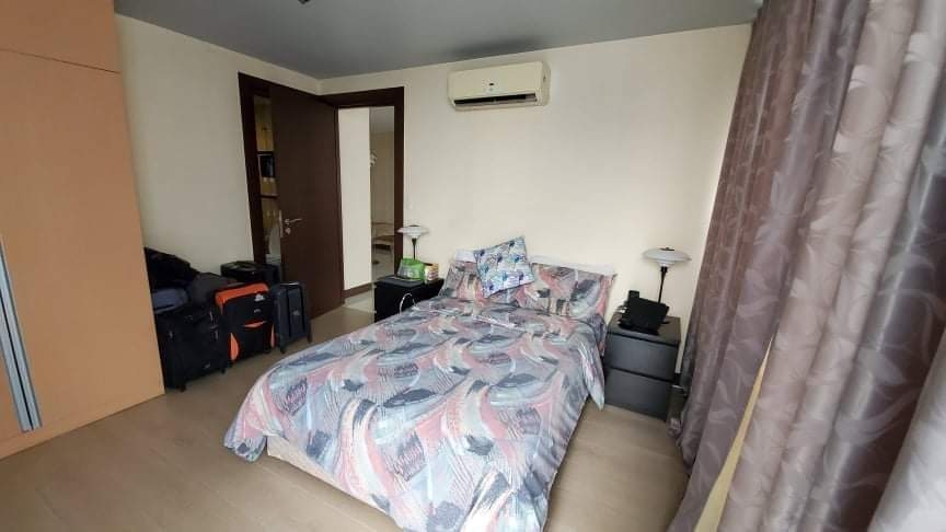 Bedroom has queen size bed, bedside cabinet with lamp on top, fitted wardrobe and split type air-conditioning
