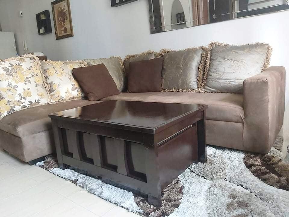 Living area is furnished with an L-shaped sofa, center table, accent rug, TV rack, television and has access to the balcony