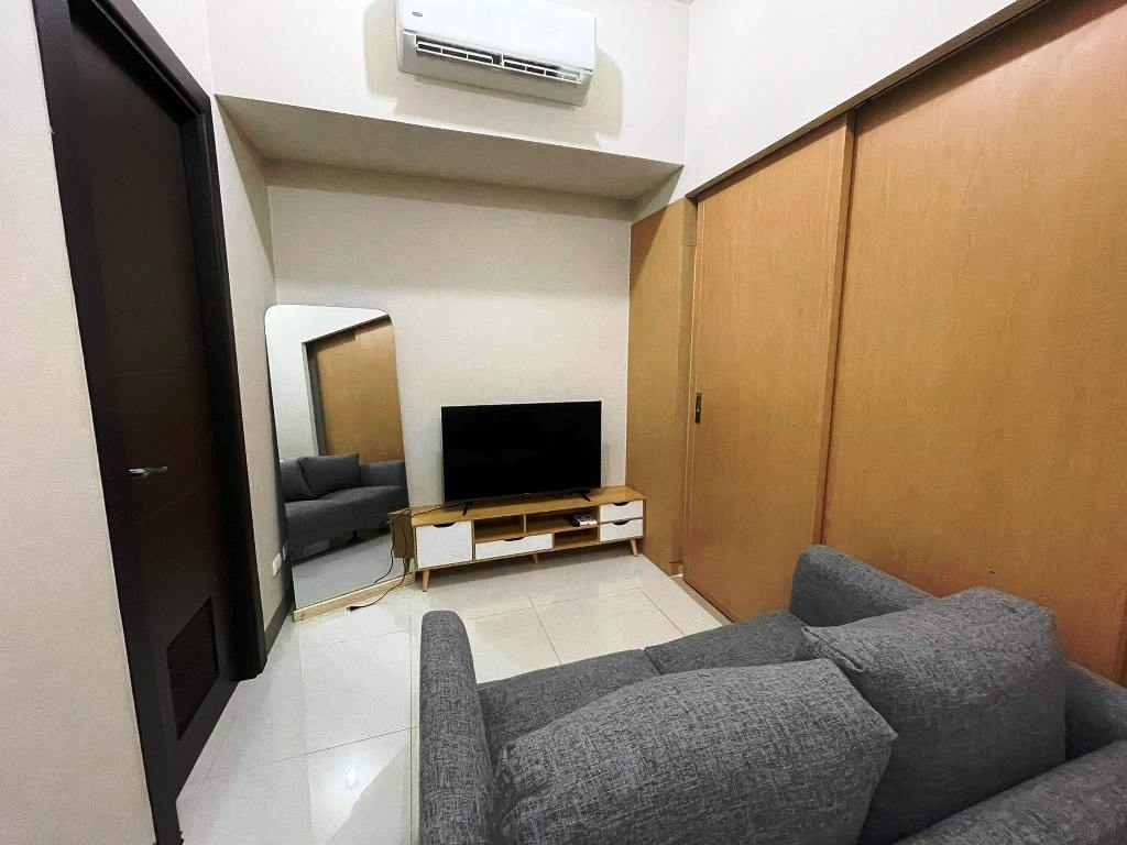 Living area is furnished with a gray sofa, TV rack, flat screen TV, full-length standing mirror and split type air-conditioning